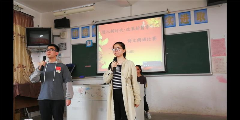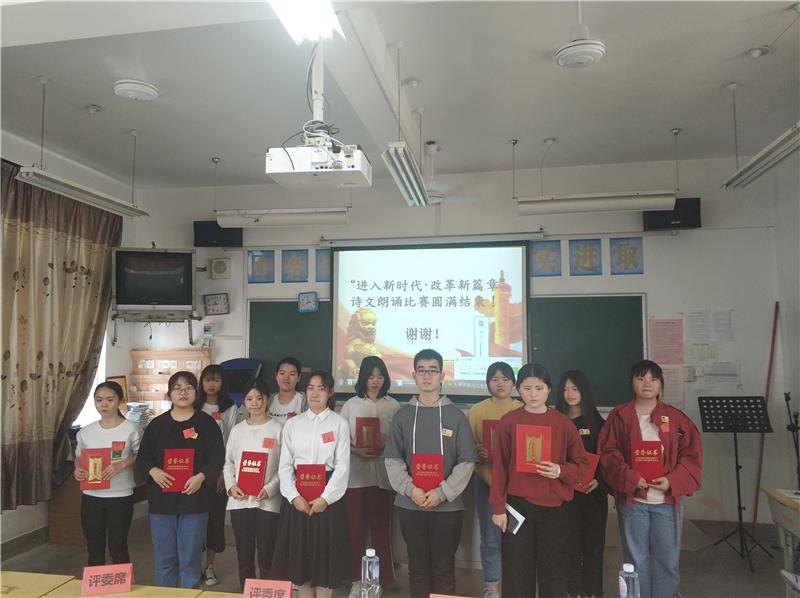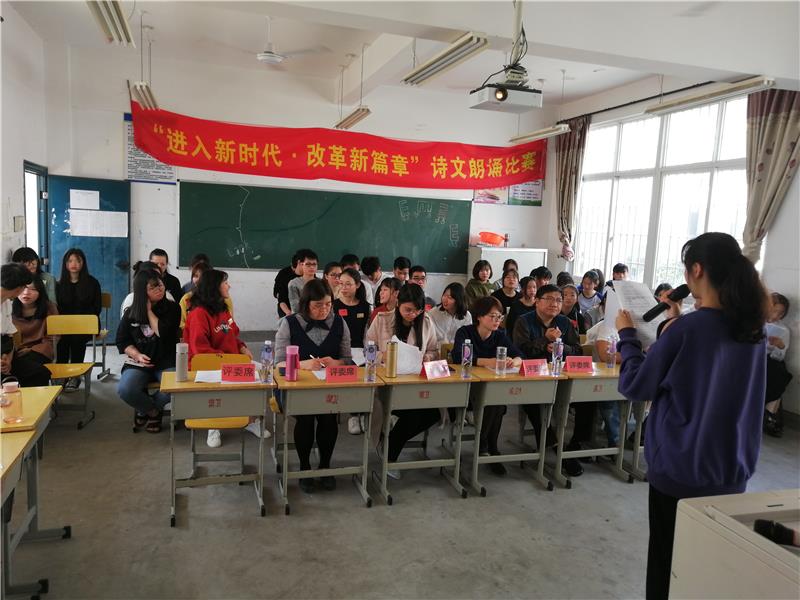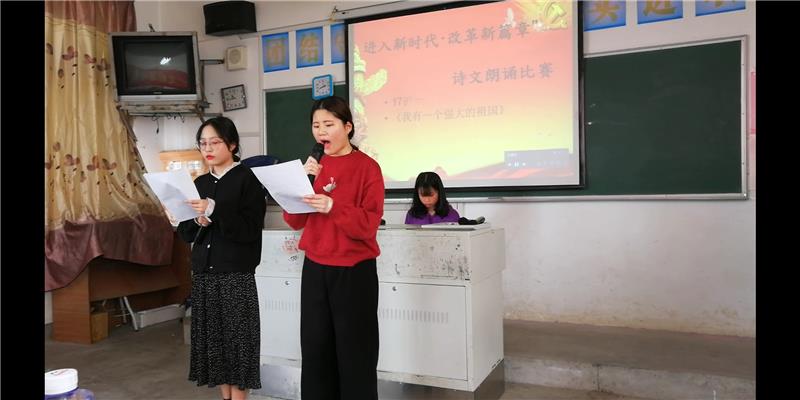 为了贯彻习近平新时代中国特色社会主义思想,弘扬中华民族传统文化,活跃校园文化气氛,增强学生爱国情怀,提高学生诗文朗诵能力和鉴赏水平,3月21日下午,我校举办了“进入新时代·改革新篇章”诗文朗诵比赛。